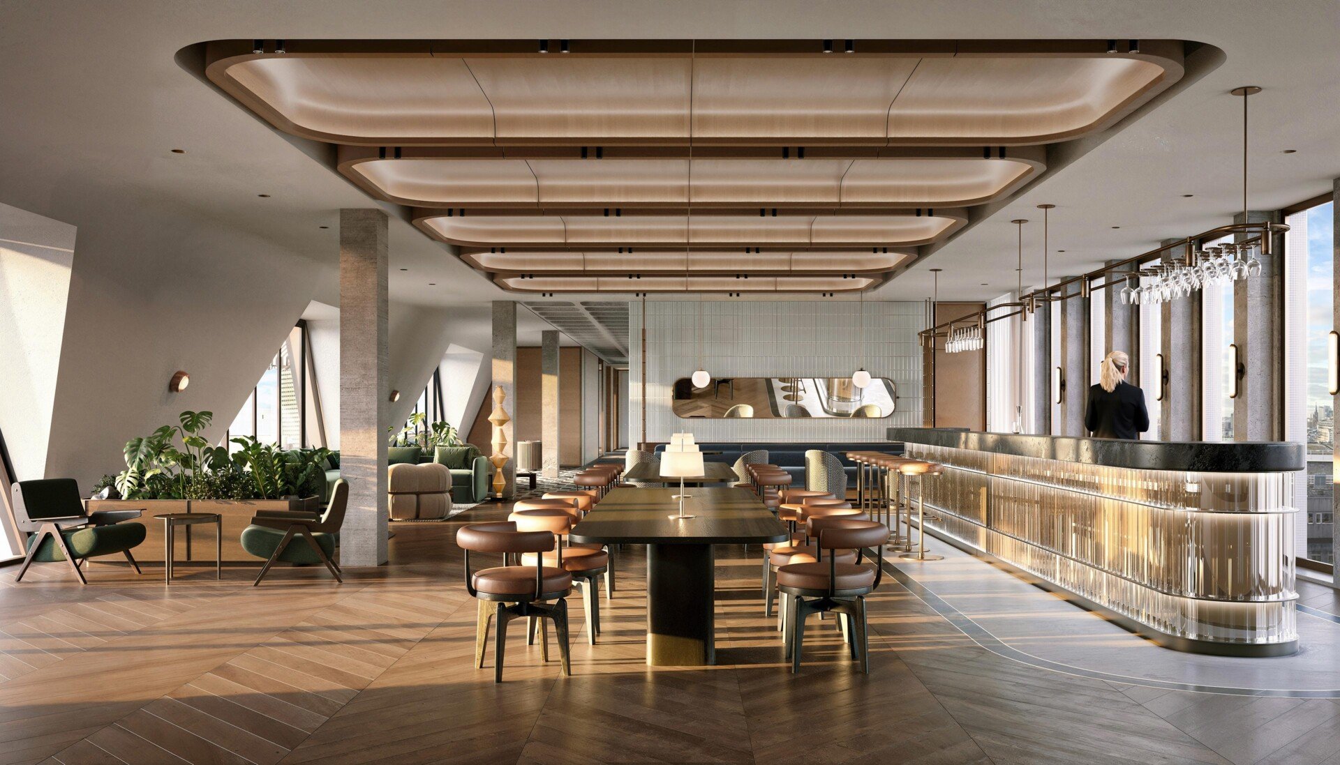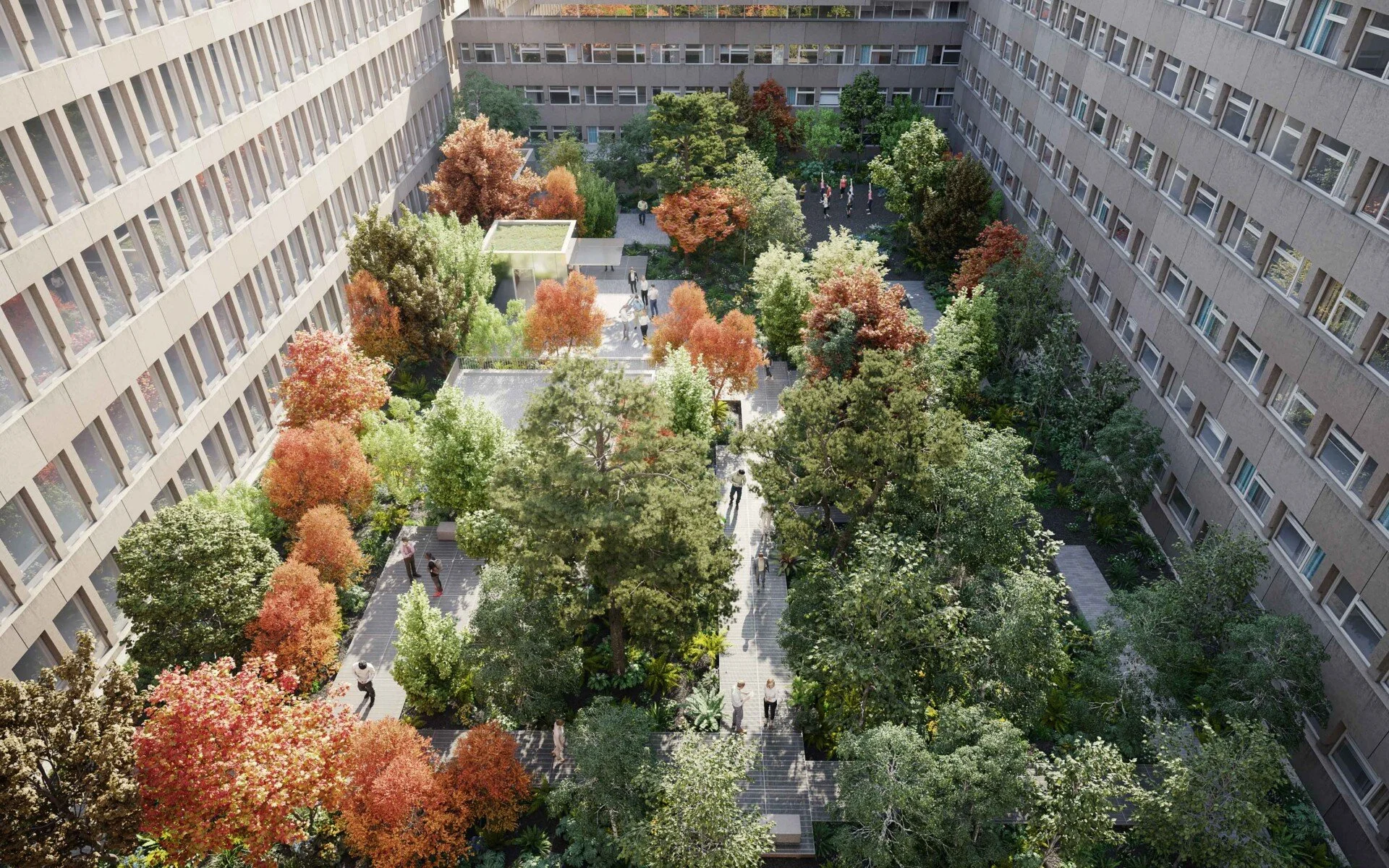 Construction of a new whitebox space within the basement, including new lighting, doors, a sliding folding door, refurbishment of existing columns, new acoustic ceiling treatment, and fire exit alterations. This space is being developed on a speculative basis.Courtyard & External Landscaping